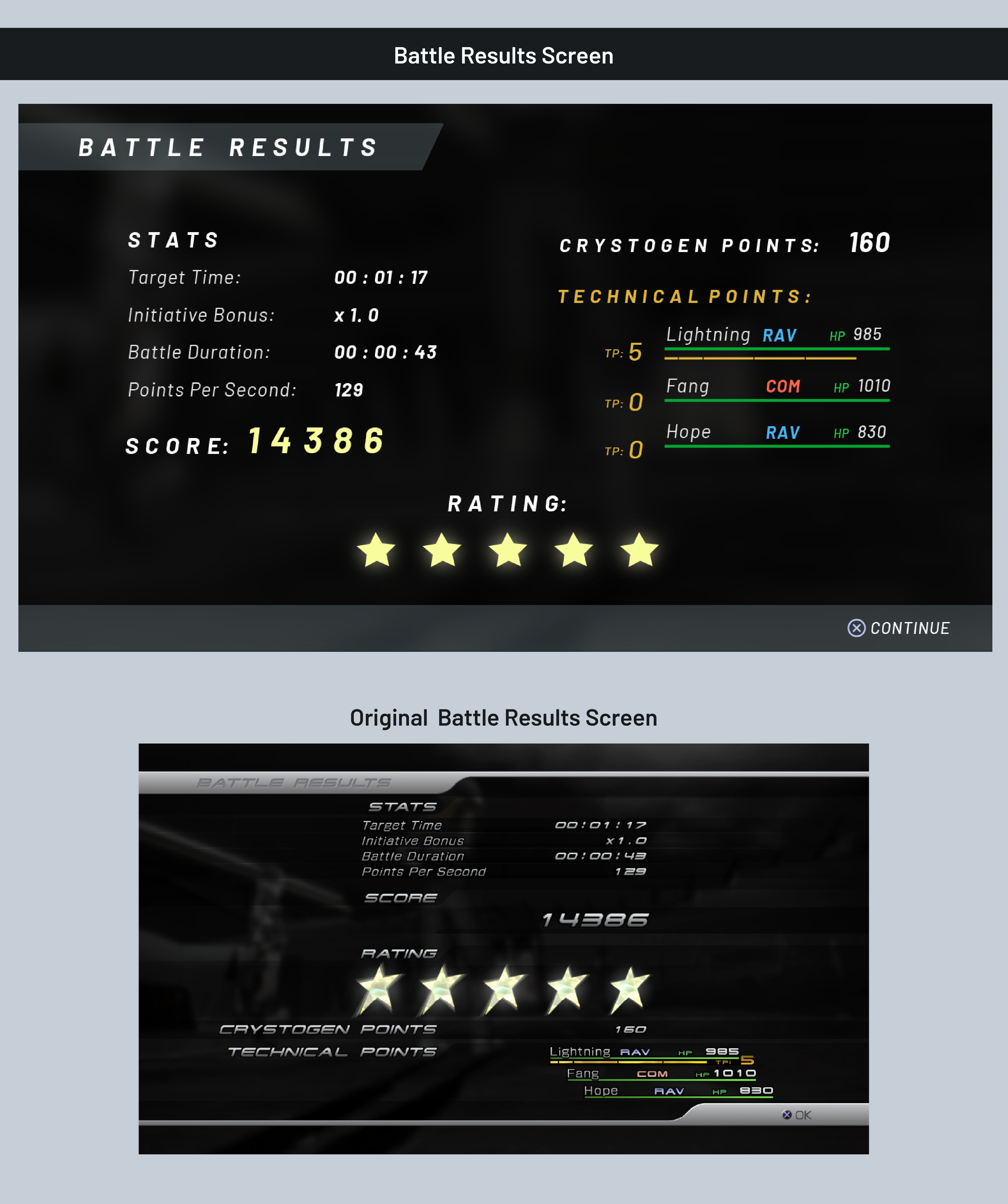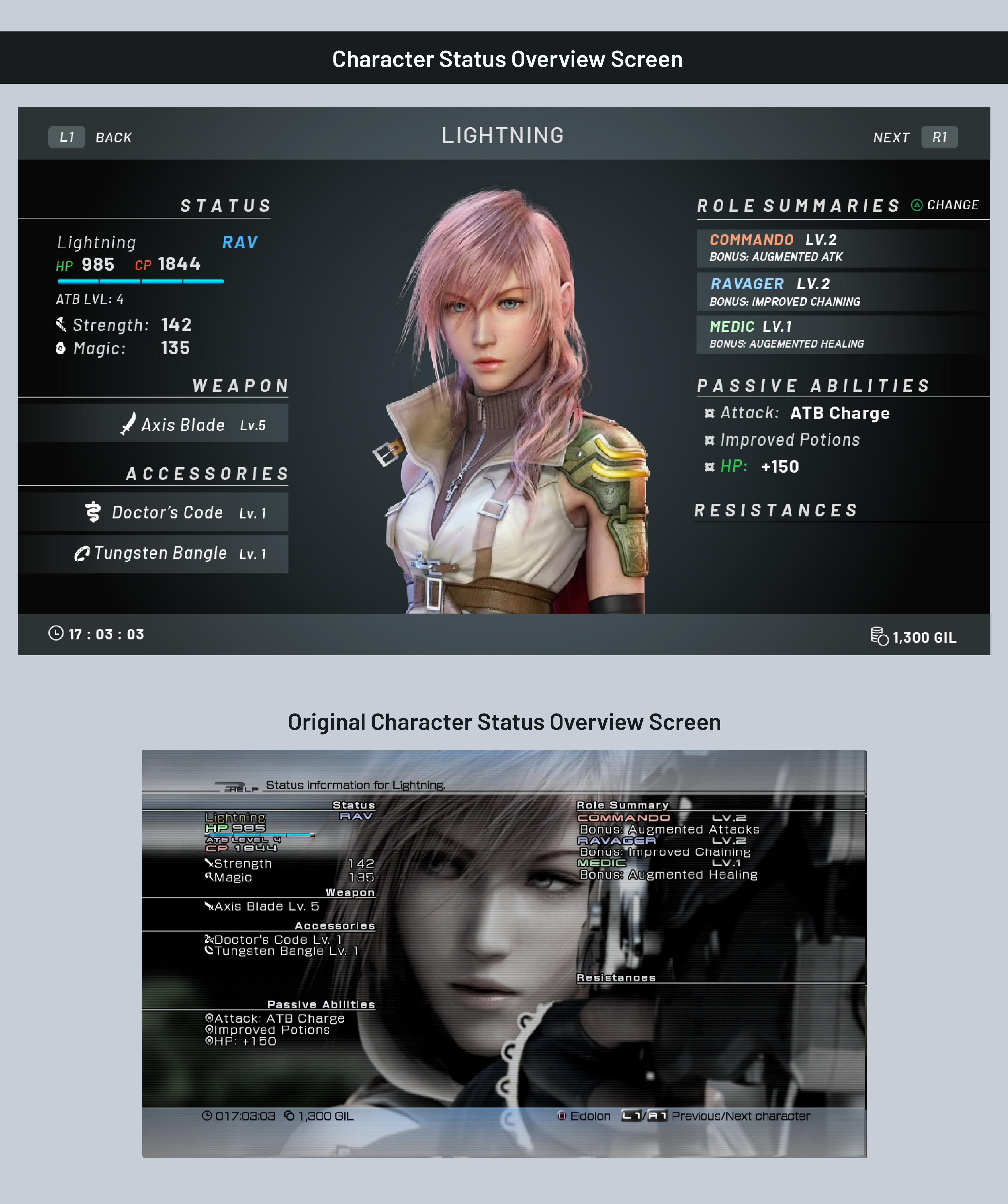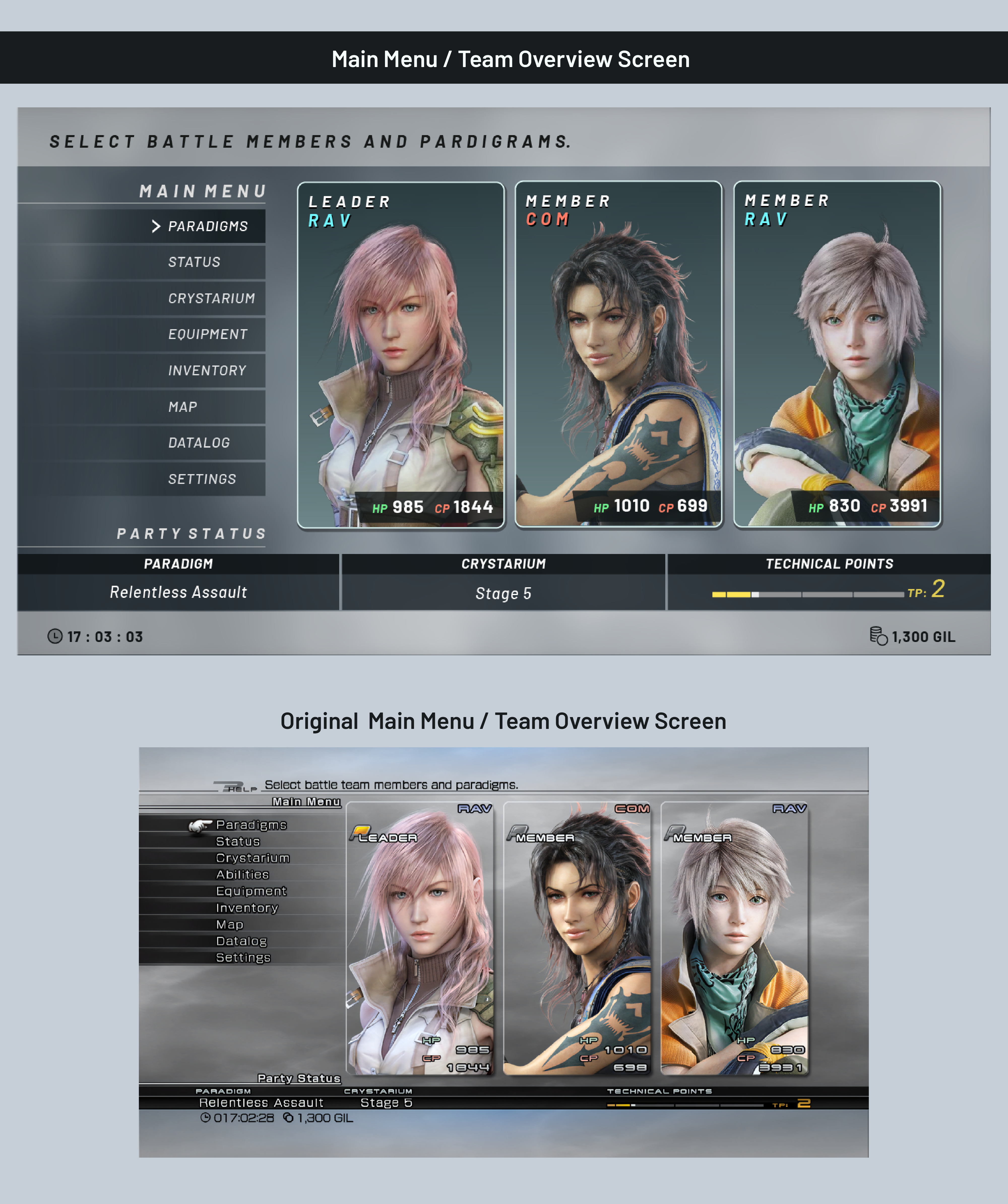 Fan Made redesign of a few core screens from Final Fantasy Xlll. During initial concepting for this redesign, I took into consideration how I wanted to solve some of the issues I came across in the original interface. The original UI felt clunky and sterile, it often suffered from over-stylization in the wrong places which negatively impacted legibility and confused clear hierarchy of information.